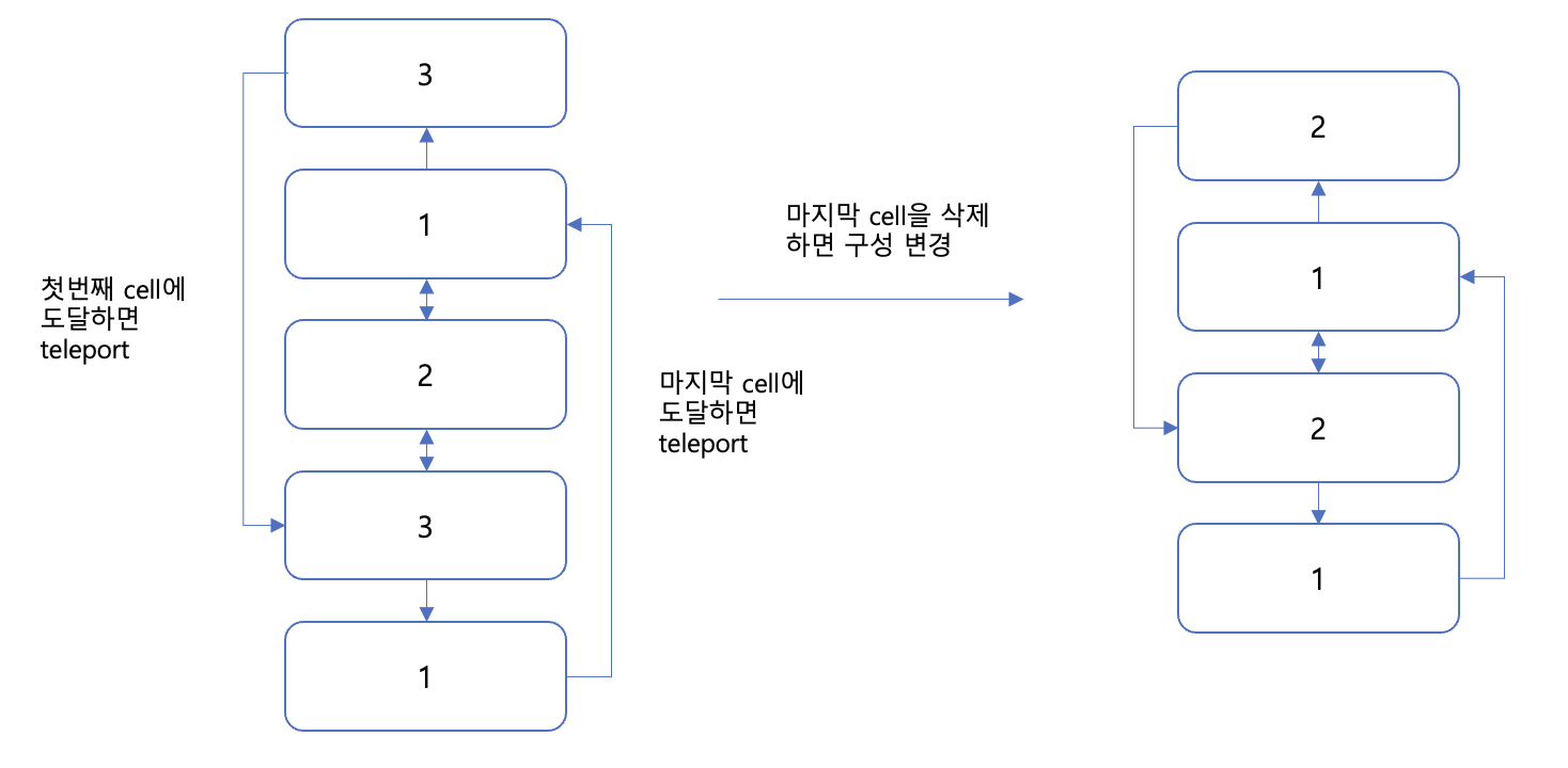 UICollectionView에서 기존 1, 2, 3 Cell로 구성되어있을 때, 무한 스크롤 효과를 주기 위해 3, 1, 2, 3, 1로 Cell 구성을 변경하고 마지막 1과 첫 번째 3에 도달했을 때 기존 Cell로 setContentOffset을 이용해 이동할 수 있도록 만들어 두었다. 이때 마지막 Cell을 삭제하게 된다면 Cell의 구조는 2, 1, 2, 1로 변경되어야 한다.