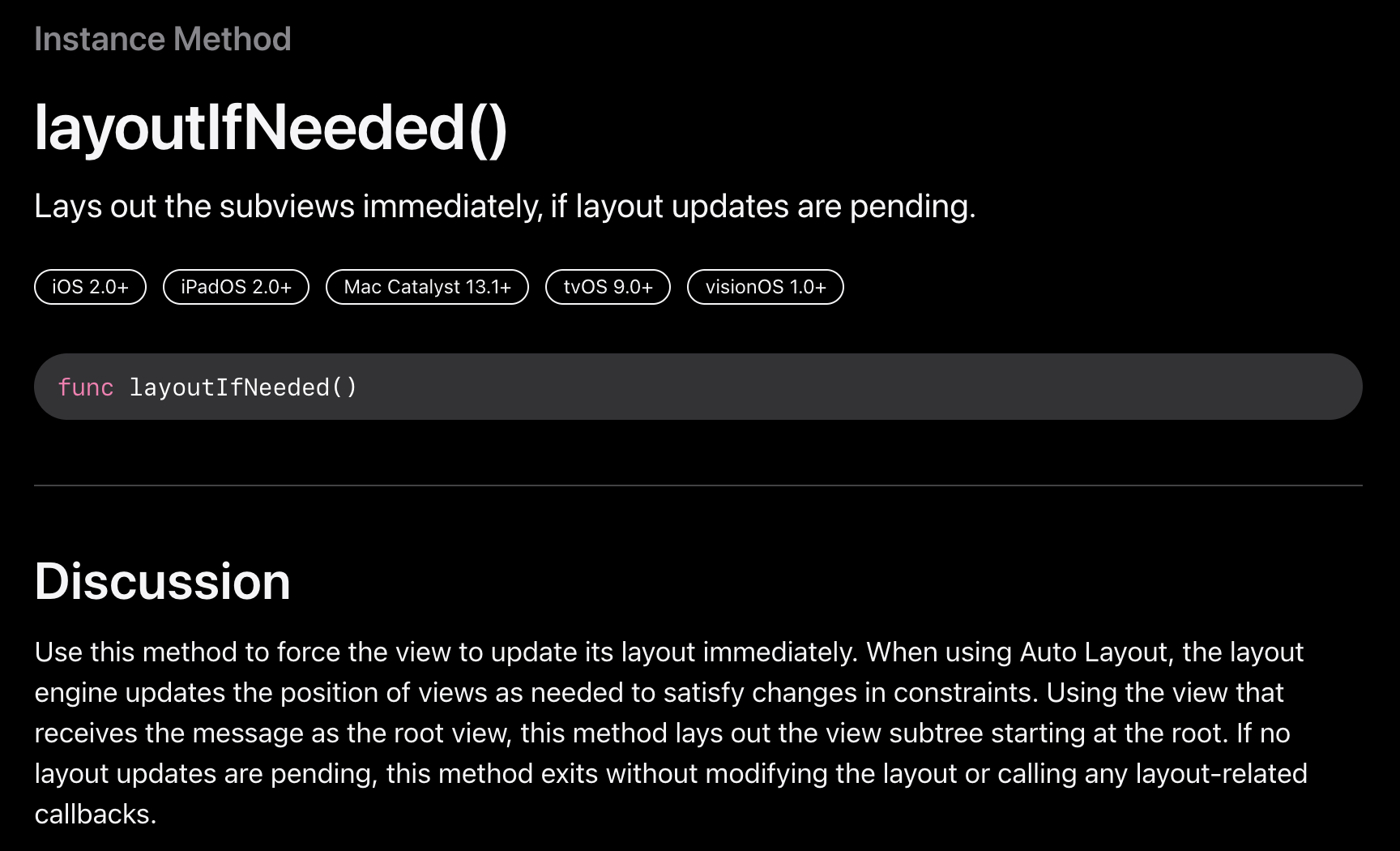 또, layoutIfNeeded의 Discussion 부분을 보면 When using Auto Layout, the layout engine updates the position of views as needed to satisfy changes in constraints. 라는 설명을 하고 있습니다.